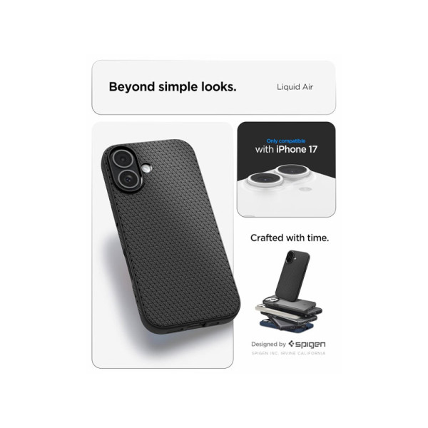The Liquid Air Case for iPhone 17 delivers slim, lightweight protection with a stylish matte finish and geometric design. Engineered with Spigen’s Air Cushion Technology, it absorbs shocks and guards against everyday drops. Its anti-slip grip, fingerprint resistance, and perfect fit with wireless charging support make it the ideal everyday case for your iPhone 17.